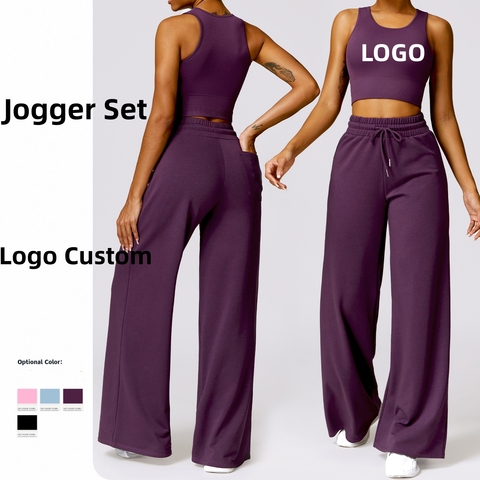 Özel Logo yeni kontrast renk moda gevşek üst geniş bacak pantolon takım elbise çalışan spor giyim Yoga egzersiz kadınlar için Set